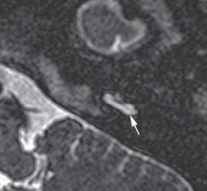 Şekil 1. İç kulak iltihabı, yani labirentit olan bir kulakta MR görüntüsü. Ok işareti işitme organı olan kokleayı (salyangoz) işaret etmektedir.
