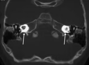Şekil 2. İç kulak taşlaşması. İki kulakta da iç kulak iltihabının iyileşmesi sırasında istenmeyen bir sonuç olan taşlaşmanın bilgisayarlı tomografi görüntüsü. Beyaz oklar bu durumu göstermektedir.